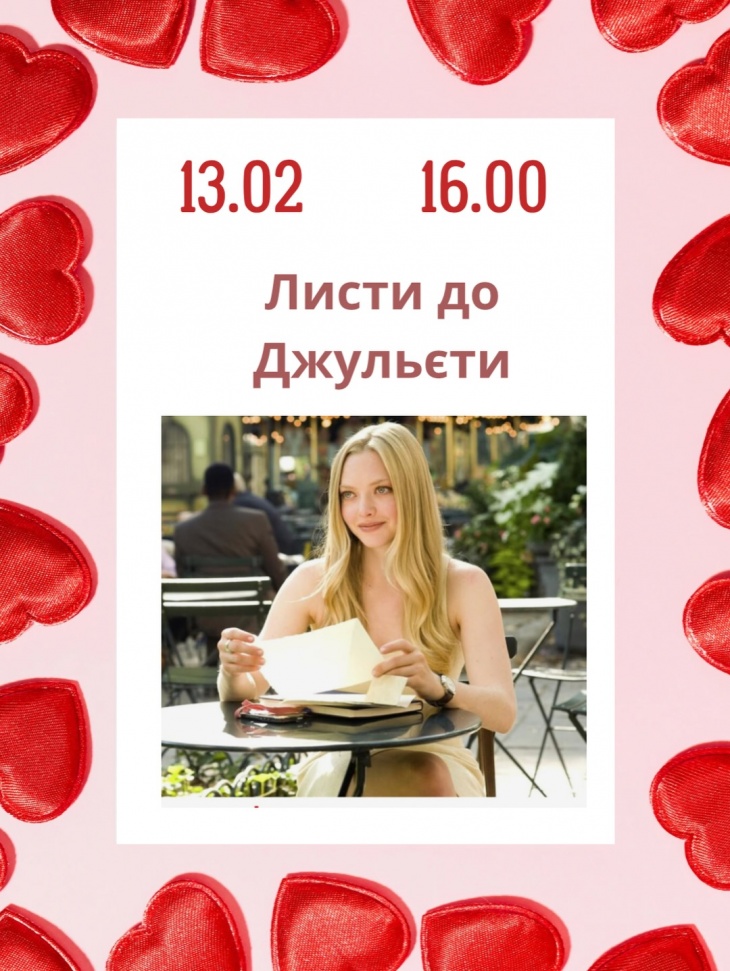 - 13 лютого — «Листи до Джульєти». Тепла історія про справжні почуття, мрії та любов у Італії.