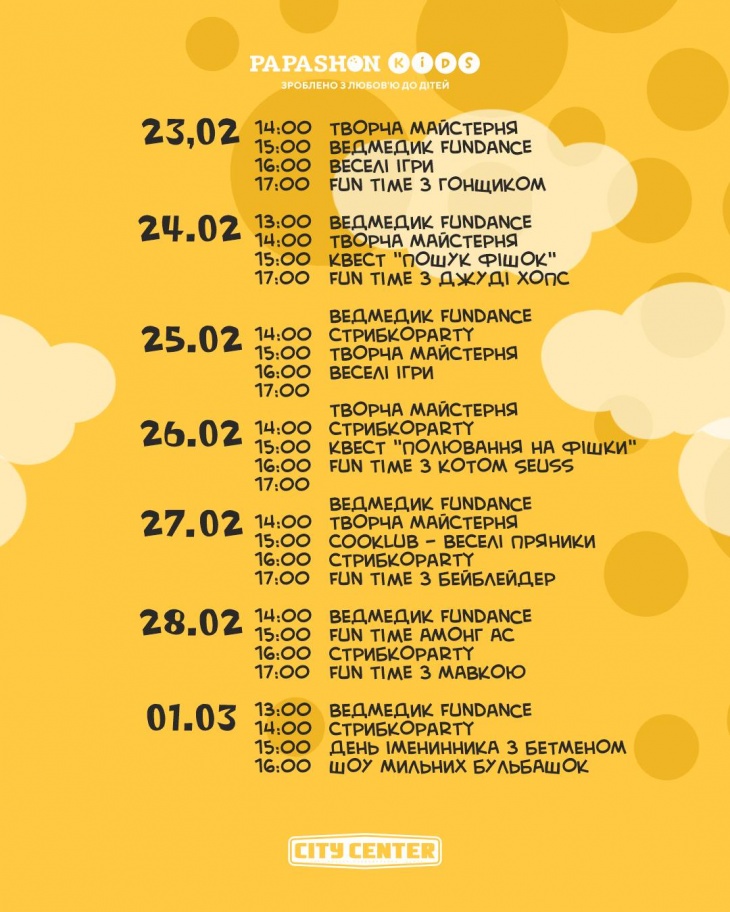 З 16 по 22 лютого у PAPASHON Kids щодня проходять безкоштовні арт-програми: творчі майстерні, ігри, квести та fun time з героями.